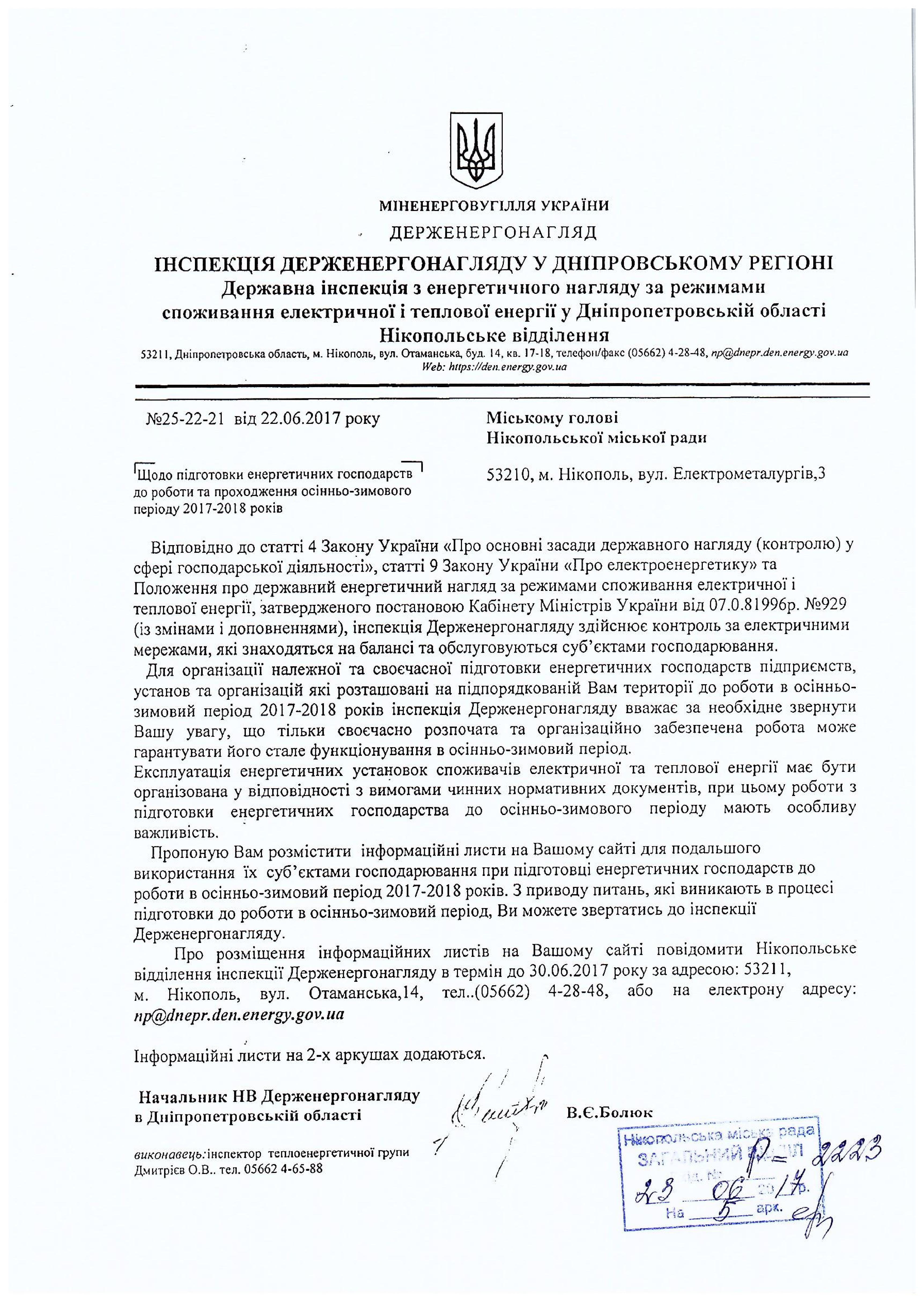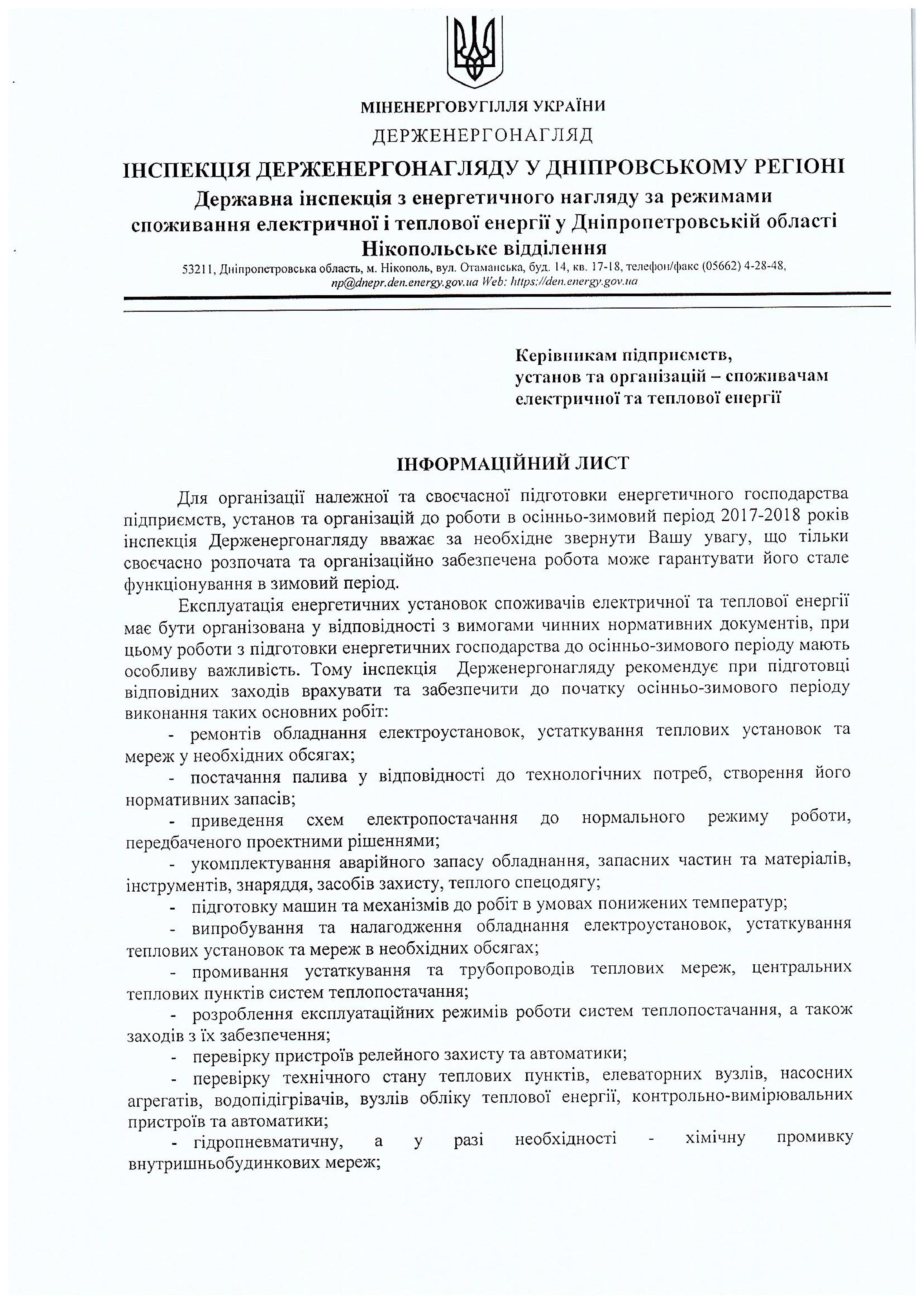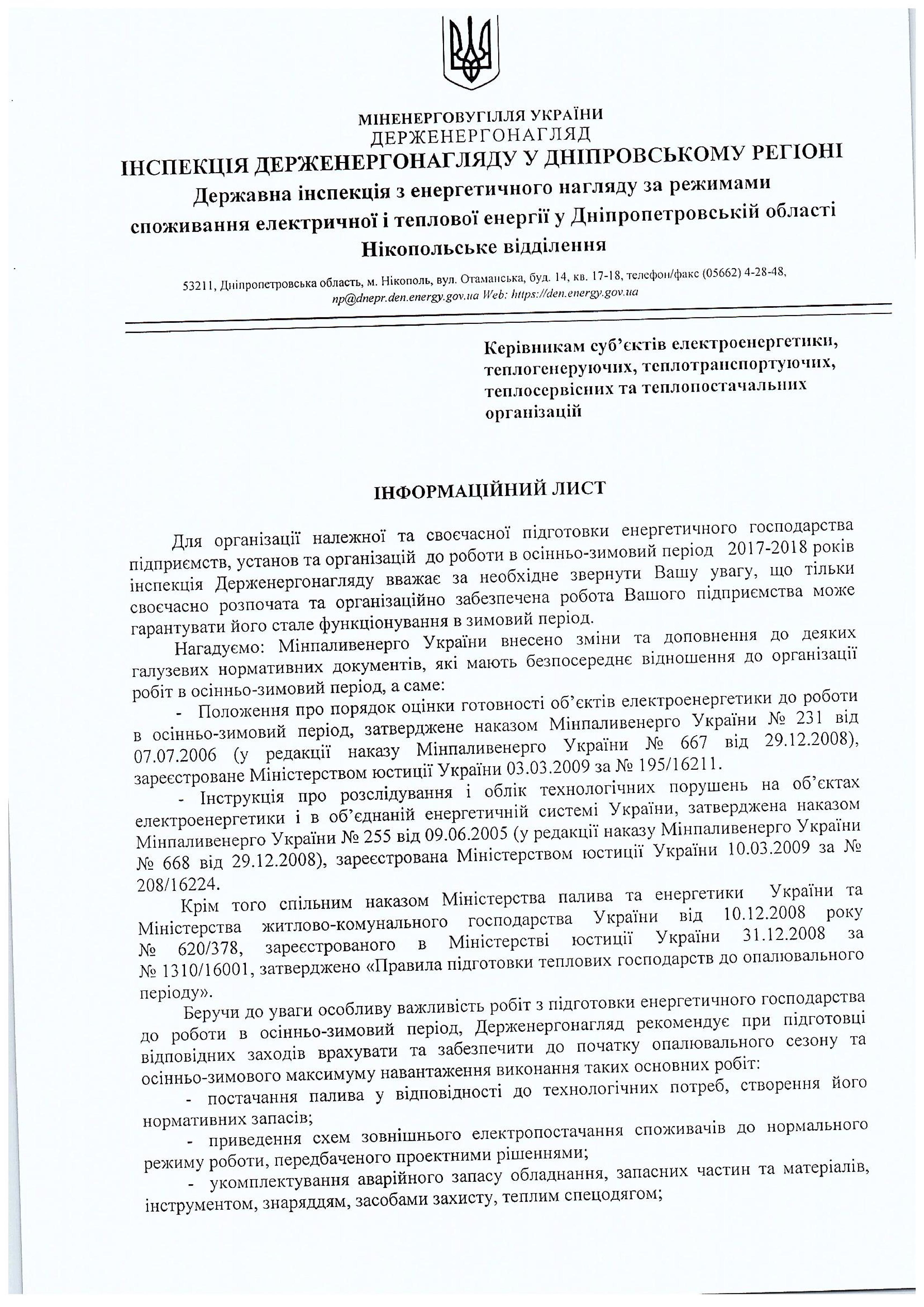 ІНФОРМАЦІЯ ДЕРЖЕНЕРГОНАГЛЯДУ У ДНІПРОПЕТРОВСЬКОМУ РЕГІОНІ