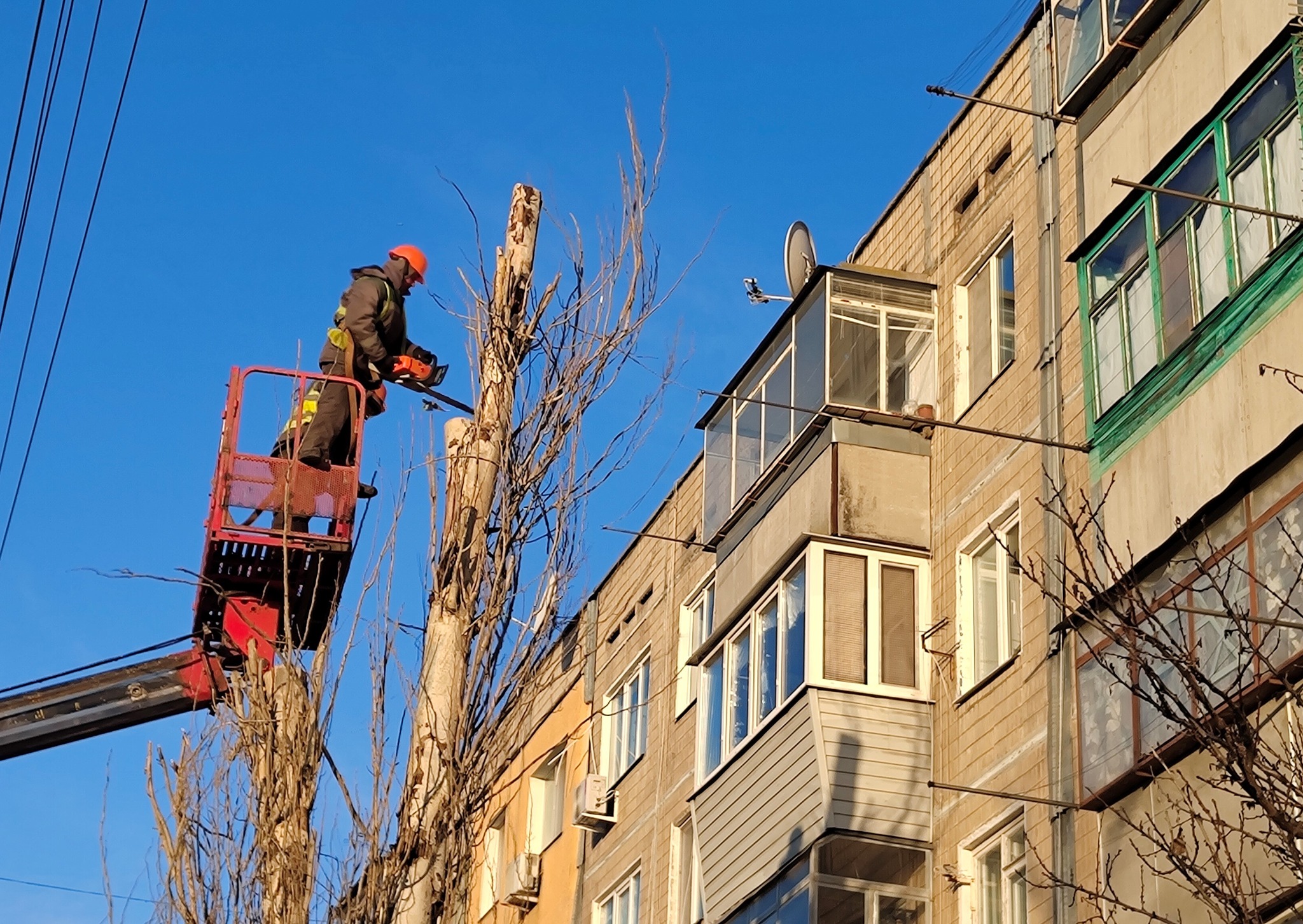 Дві бригади комунальників проводять знос аварійних дерев, що ростуть поруч із багатоквартирними будинками, оскільки такі дерева можуть упасти від вибухової хвилі або сильного вітру та завдати шкоди людям і майну.